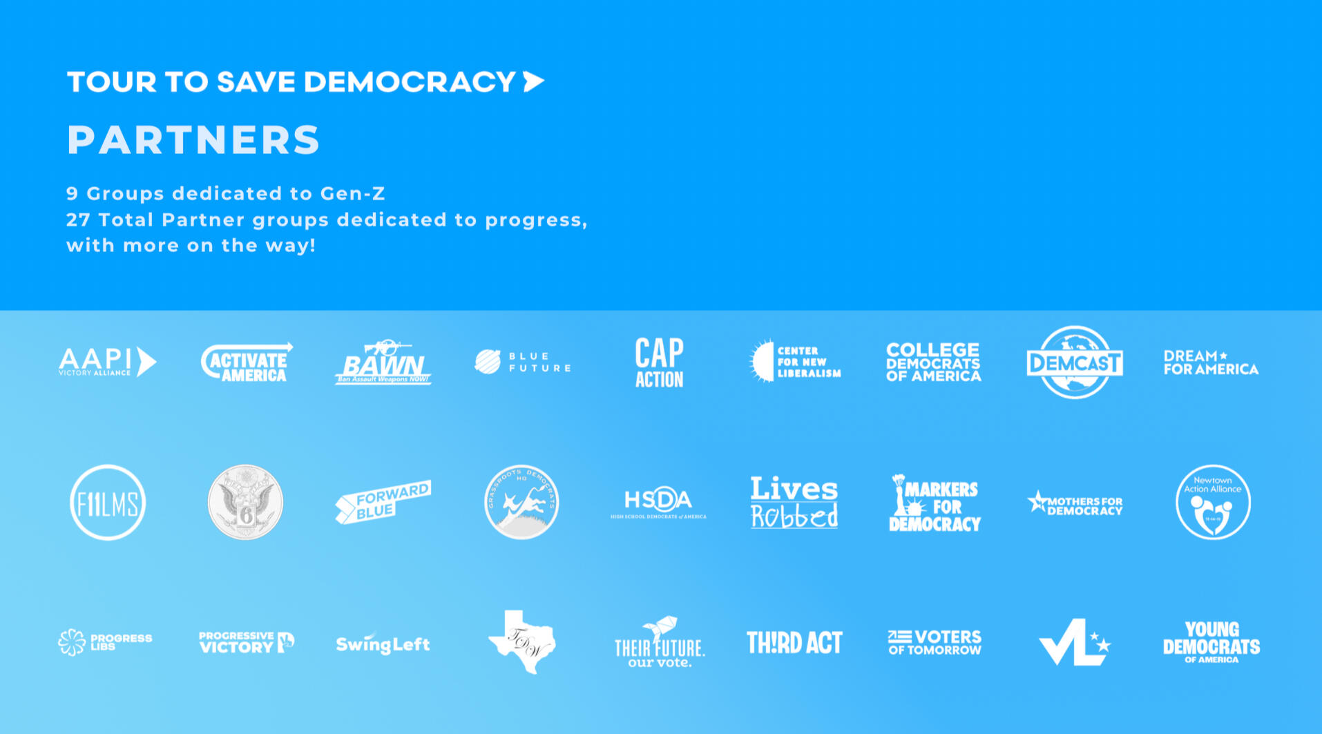 Tour to Save DemocracyAs Creative Director, I built the brand identity and graphics behind this one of a kind, gen z led project. Our work scaled from tangible, in-person events in over 21 cities across the US, averaging in hundreds of attendees at each stop, to social media initiatives with over 400+ million impressions.